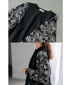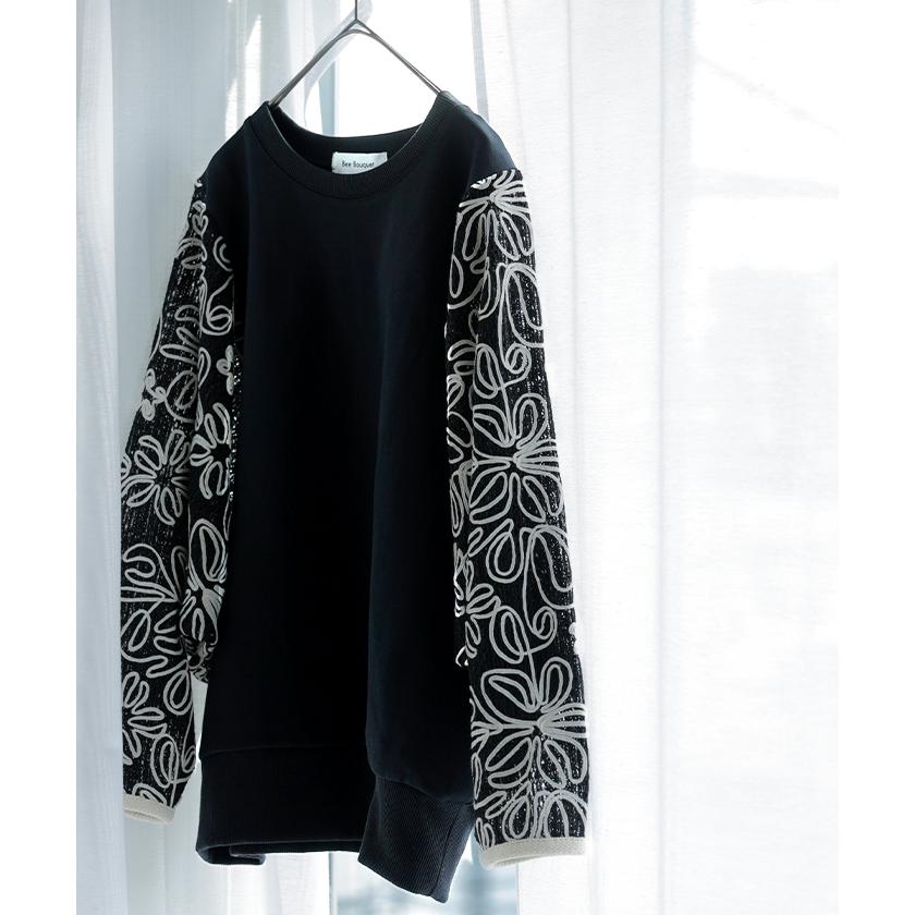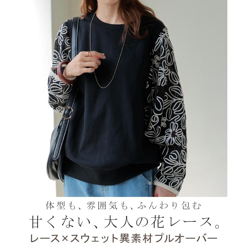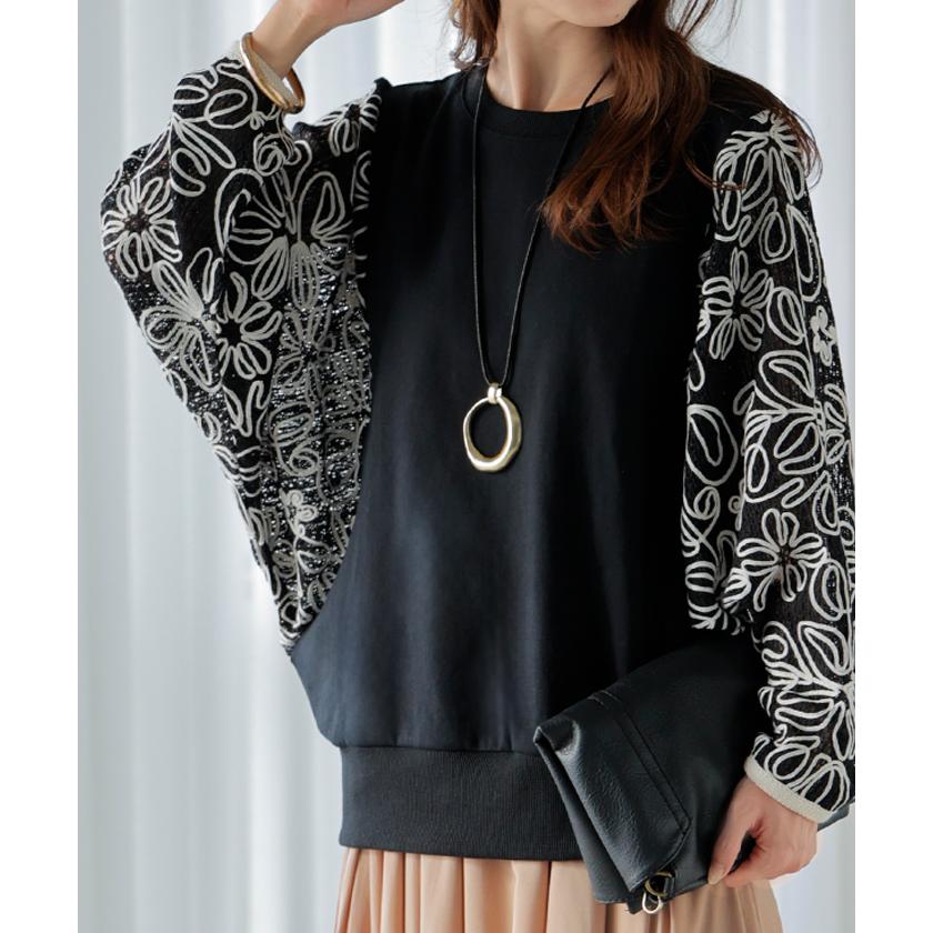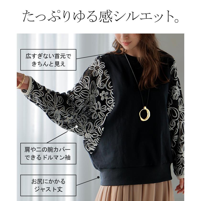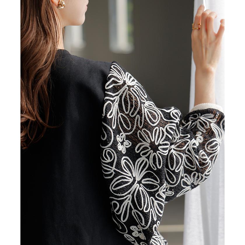 刺繍 刺繍トップス コード刺繍 ドッキング 異素材 異素材ドッキング ドッキングスウェット ドッキングスエット ドッキングスウエット ドッキングトップス ドッキングプルオーバー 異素材スウェット ドルマントップス ドルマン ドルマン袖 ドルマンスリーブ 花 花トップス シアー シースルー 透け 透け感 スエット スウエット ビッグスウェット コクーン コクーンシルエット 二の腕カバー 二の腕隠し モノトーン 白 黒 白黒 モード ブラック 黒 黒色 ホワイト 白 白色 レディースファッション 旬 トレンド S M L LL 2L XL 3L XXL LLL カジュアル ベーシック オフィス オフィスカジュアル 着回し シンプル 大人 大人カジュアル オトナ 女性 20代 30代 40代 50代 60代 おしゃれ お洒落 オシャレ 可愛い かわいい カワイイ カッコいい カッコイイ 春 夏 秋 冬 春夏 秋冬 HUG.U HUGU ハグユー はぐゆー ドルマン クルーネック レース 刺繍 ボリュームスリーブ ゆったり 体型カバー